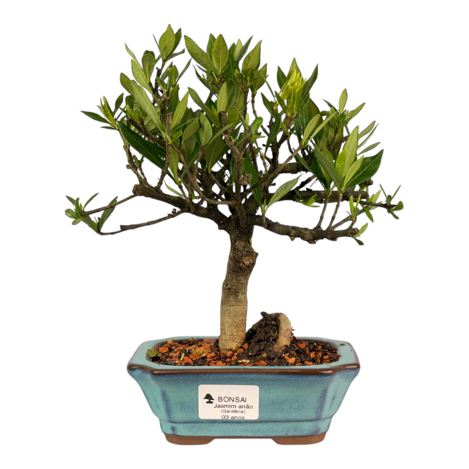 Características: É originária da Ásia, sendo que a maioria das espécies é encontrada no sul da China, Taiwan e Japão. Na natureza apresentam crescimento arbustivo não chegando a um metro de altura e suas folhas são verdes, pequenas e brilhantes. Suas flores são dobradas, brancas e com uma forte fragrância típica dos jasmins. O gênero apresenta muitas espécies, mas a mais cultivada no Brasil para bonsai é a Gardênia jasminoides Radicans, conhecida como Jasmim anão.