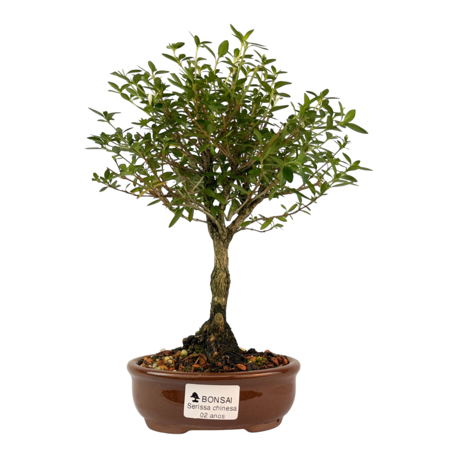 Características: Arbusto perene de folha verde ovalada de reduzida dimensão, existem diferentes variedades, a mais comercializada como Bonsai é a Serissa Chinesa e é produzida na China, existem ainda a Serissa Japônica e a Serissa de Shangai (menos comuns no nosso mercado), todas possuem uma versão variegata (de folhas brancas e verdes), a qual se deve a um vírus inócuo que terá afetado a planta mãe na origem.